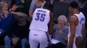 Durante il match tra i Thunder di Oklahoma City e i Los Angeles Clippers il pallone sfugge alla presa di un giocatore durante un passaggio e colpisce un’anziana signora seduta proprio a ridosso del parquet. Ma Kevin Durant dei Thunder va subito a sincerarsi che la nonnina sia ancora intera e le schiocca un bacio sulla fronte. Poi la palla colpisce sempre la stessa tifosa, che rimane al suo posto.