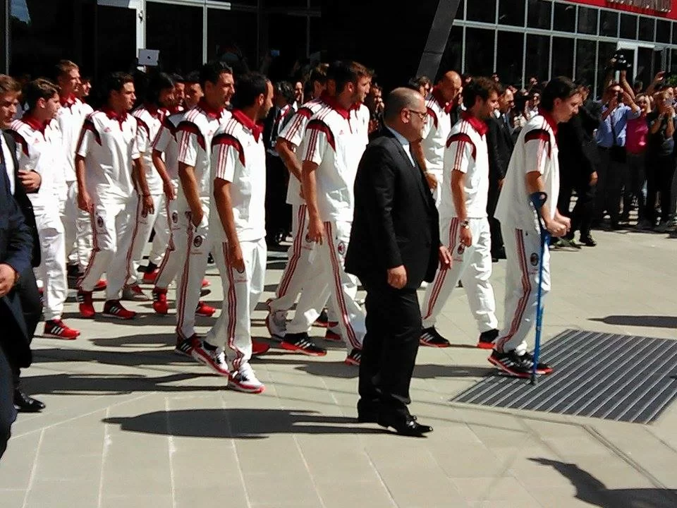 La tanta attesa presentazione della squadra. I componenti della rosa sono preceduti da Adriano Galliani e Barbara Berlusconi (con una splendida maglietta rossonera, clicca qui)