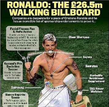 Dalla Clear shampoo alla Toyota, dal videogame PES alla Nike. Sono solo alcuni brand di cui Cristiano Ronaldo è uomo immagine e che fanno guadagnare, da soli, circa 35 milioni di euro all’anno al bomber portoghese. Il calcolo è stato effettuato dal Daily Mail, che ha pubblicato un’immagine di CR7 con addosso gli oggetti dei suoi guadagni. Ronaldo è recordman anche sui social, con 100milioni di fan su Facebook e 30milioni su Twitter.