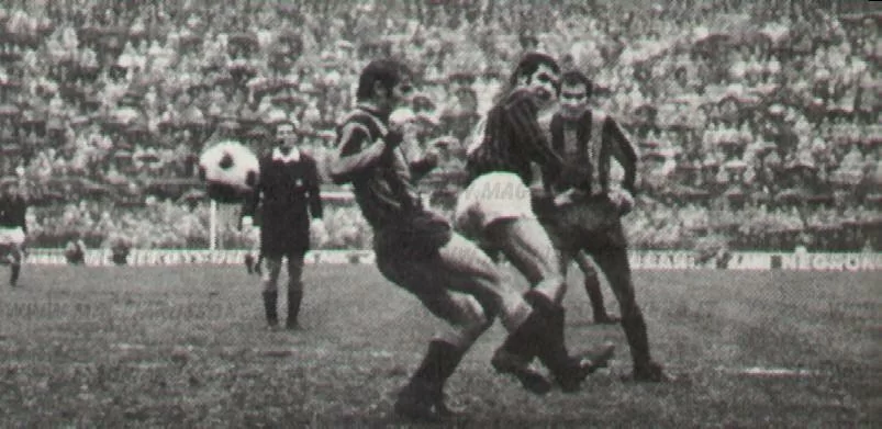 12 Giugno 1975 i Rossoneri vincono 1-0 contro la Juventus la seconda gara nel girone di semifinale di Coppa Italia con la rete di Bigon al 76′.