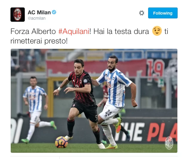 Tramite il proprio profilo Twitter, il Milan ha augurato una pronta guarigione ad Alberto Aquilani, che, durante la gara odierna, a seguito di uno scontro fortuito con Memushaj, è stato costretto a uscire dal terreno di gioco in barella: