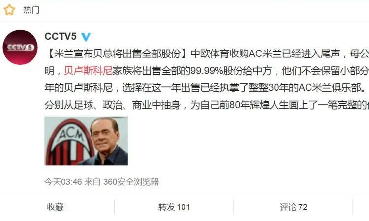 Ma le novità non finiscono qui. La tv di Stato cinese, CCTV5, ha voluto pubblicare tramite i propri social un “sincero ringraziamento per i 30 anni di Milan” all’attuale presidente rossonero, Silvio Berlusconi. Dopo il tributo, l’emittente ha confermato l’acquisizione del club rossonero per il 99,9% delle quote, operazione con protagonista Sino-Europe.