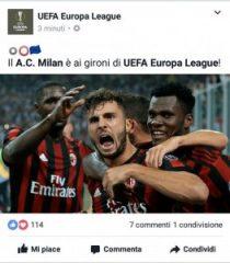 Con un post apparso per pochi minuti sulla propria pagina Facebook, la Uefa annuncia erroneamente il passaggio del Milan ai gironi di . La vittoria contro il Craiova di ieri sera ha sancito “solo” la qualificazione ai playoff della stessa competizione europea. Una gaffe da dimenticare per il massimo organismo calcistico europeo.