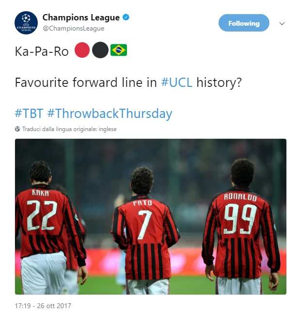 L’account Twitter ufficiale della UEFA Champions League ha voluto fare un tuffo nel passato, riproponendo uno scatto del tridente Kakà-Pato-Ronaldo e chiedendo agli utenti di Twitter un giudizio sulla possibilità di preferenza assoluta per il terzetto composto dai brasiliani.