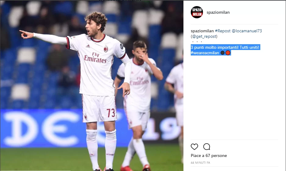 Manuel Locatelli dal suo profilo ufficiale di instagram ha esultato cosi per la vittoria contro il Sassuolo: "3 punti molto importanti! Tutti uniti! #weareacmilan ⚫️🔴"