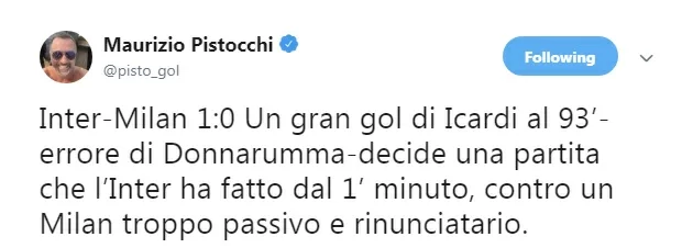 L’Inter vince il derby battendo il Milan con un gol di Icardi in pieno recupero, ma è parsa fin troppo evidente la complicità di Gigio Donnarumma che nell’occasione della rete ha completamente sbagliato il tempo d’uscita, spalancando la porta all’attaccante interista.