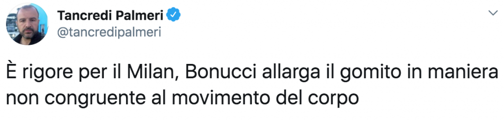 Il giornalista Tancredi Palmeri, su Twitter, ha dato ragione al direttore di gara: “È rigore per il Milan, Bonucci allarga il gomito in maniera non congruente al movimento del corpo“.