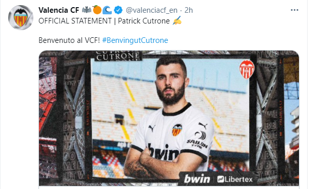 Mancava soltanto l’ufficialità che è puntualmente arrivata, Patrick Cutrone è un nuovo calciatore del Valencia.