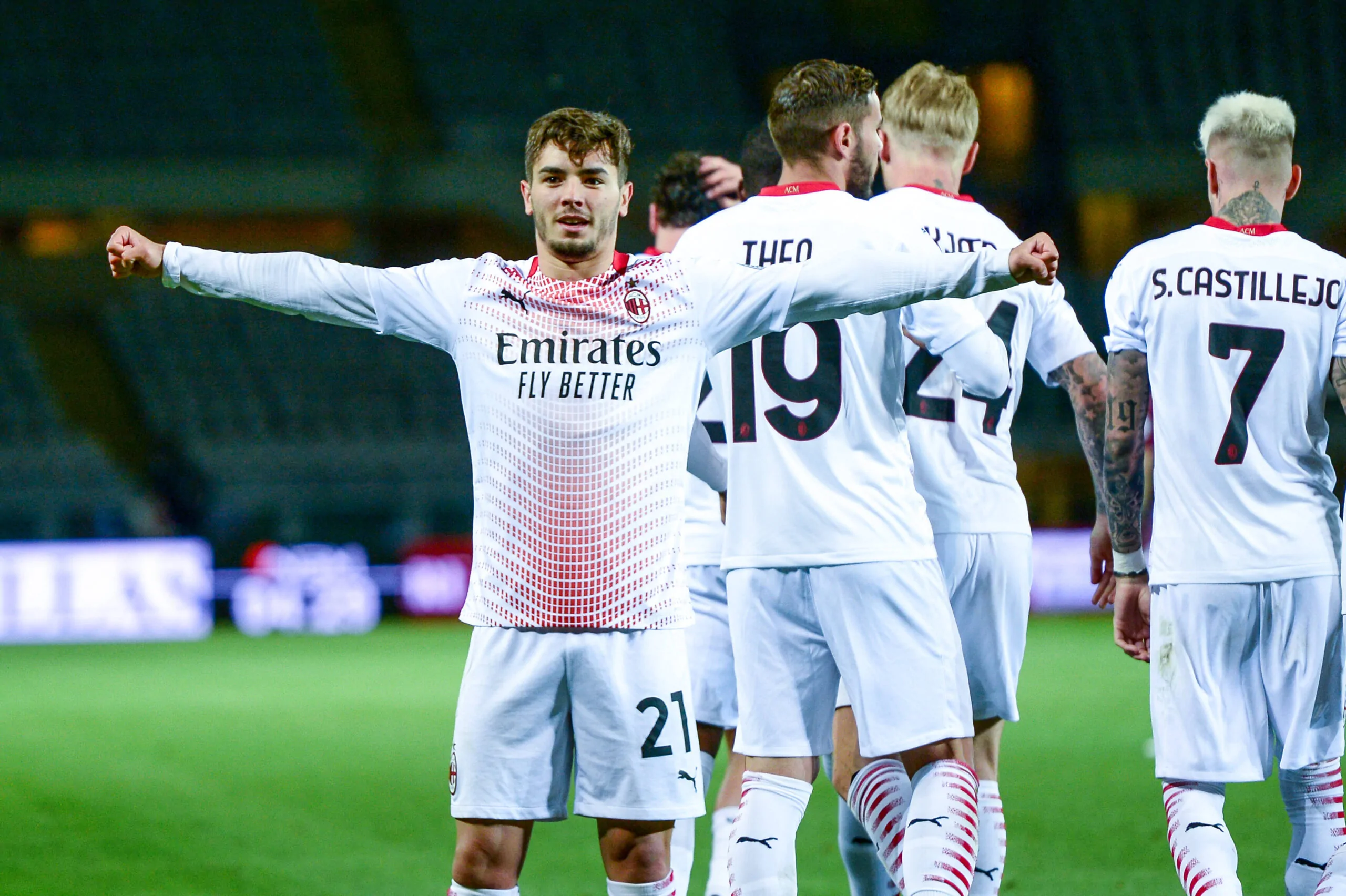 Italy: Torino vs Milan Brahim Diaz of AC Milan celebrates an goal with his team mates during the Serie A football match between Torino FC and AC Milan. Sporting stadiums around Italy remain under strict restrictions due to the Coronavirus Pandemic as Government social distancing laws prohibit fans inside venues resulting in games being played behind closed doors. Milan won 0-6 over Torino FC Turin Piedmont Italy Copyright: AlbertoxGandolfo