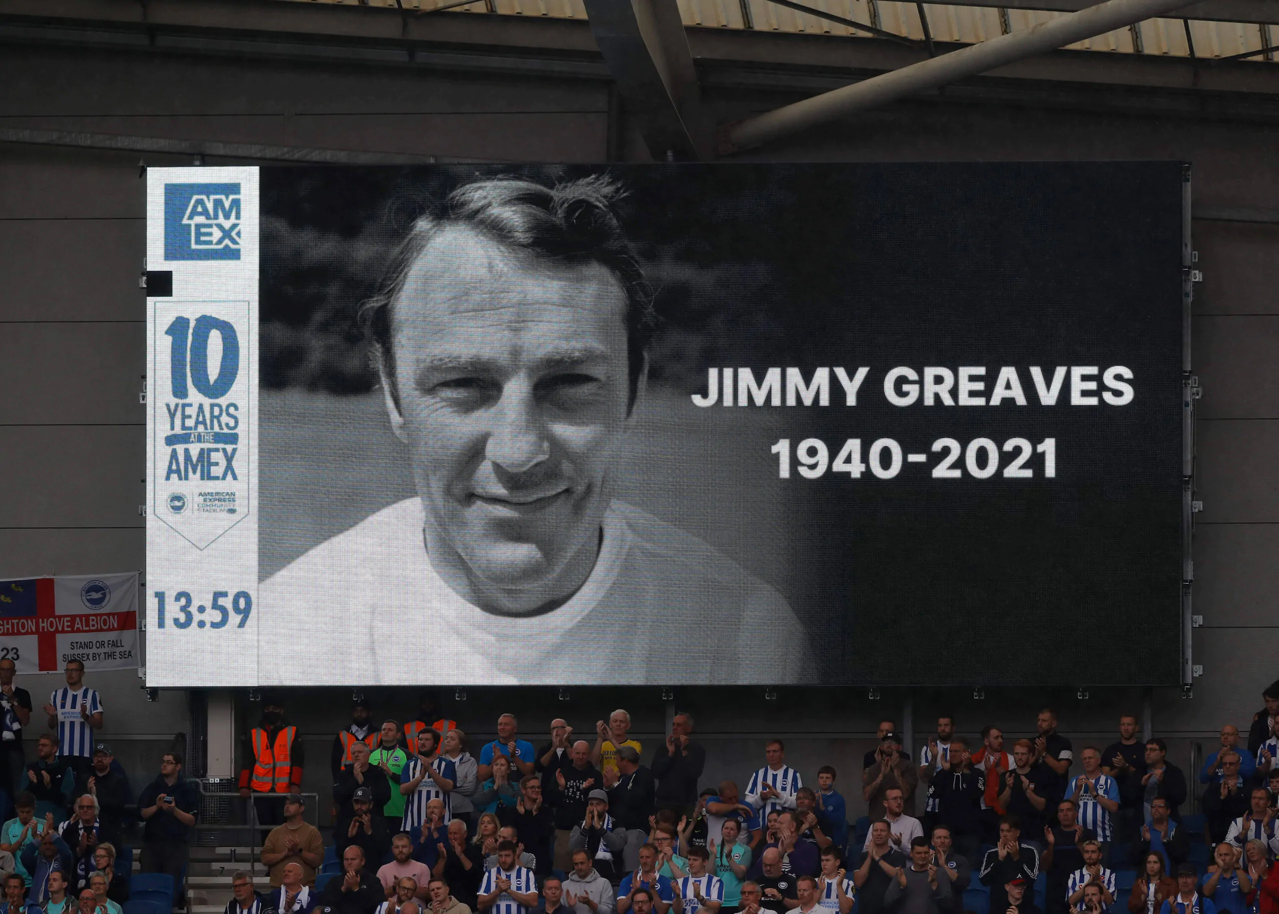 19th September 2021 American Express Community Stadium, Brighton, East Sussex England Premier League football Brighton & Hove Albion versus Leicester City Giant scoreboard displaying a tribute to Jimmy Greaves MBE, who died at 81 years on 19th September 2021 PUBLICATIONxNOTxINxUK ActionPlus12323868 JohnxPatrickxFletcher