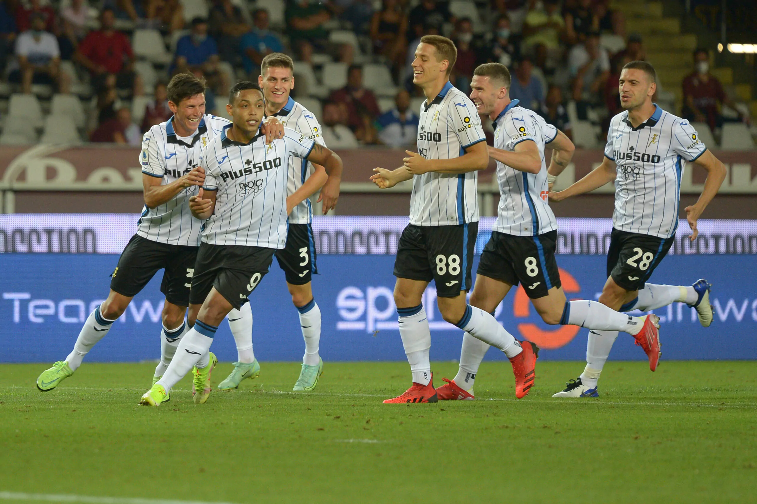 Italy: Torino vs Atalanta Serie A Luis Muriel of Atalanta BC celebrates whit his teammates during the Serie A match between Torino FC and Atlanta BC. Atalanta BC won 1-3 over Torino FC Turin Piedmont Italy Copyright: AlbertoxGandolfo