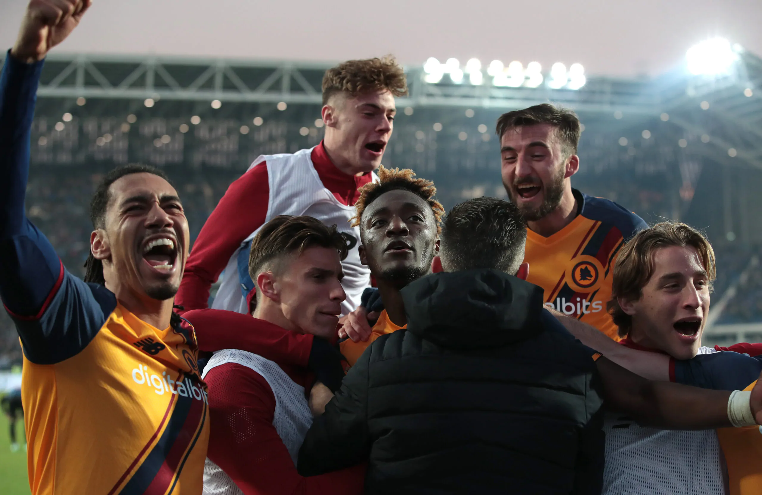BERGAMO, ITALY - DECEMBER 18: Tammy Abraham of AS Roma celebrates scoring the fourth goal with his team mates during the Serie A match between Atalanta BC and AS Roma at Gewiss Stadium on December 18, 2021 in Bergamo, Italy. (Photo by Emilio Andreoli/Getty Images)