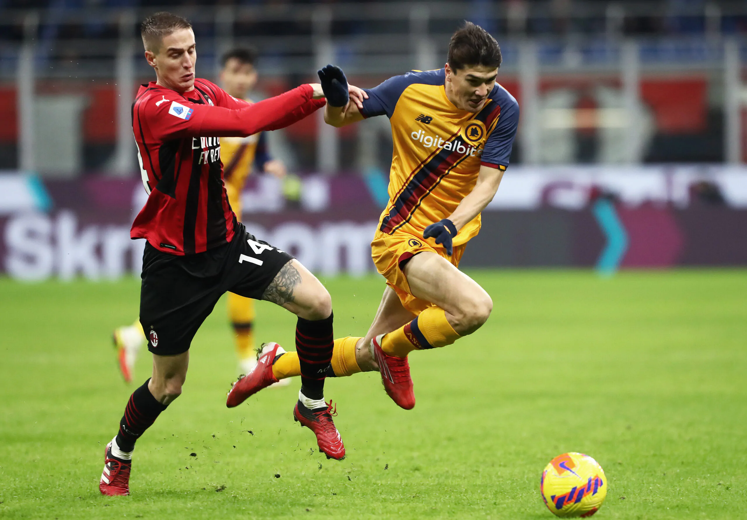 MILAN, ITALY - JANUARY 06: Andrea Conti of AC Milan battles with Eldor Shomurodov of AS Roma during the Serie A match between AC Milan and AS Roma at Stadio Giuseppe Meazza on January 06, 2022 in Milan, Italy. (Photo by Marco Luzzani/Getty Images)