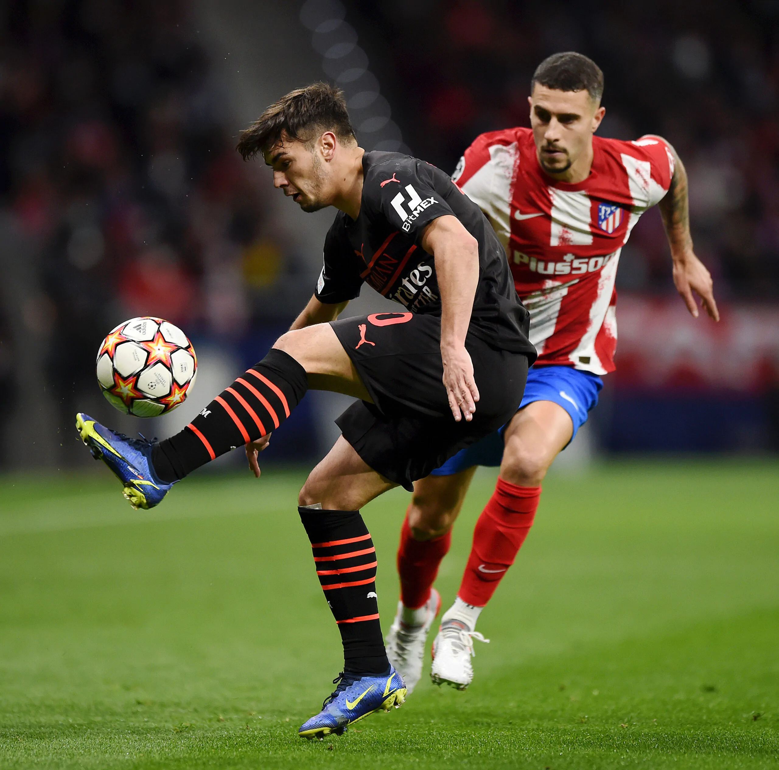 MADRID, SPAIN - NOVEMBER 24: Brahim Diaz of AC Milan is challenged by Mario Hermoso of Atletico Madrid during the UEFA Champions League group B match between Atletico Madrid and AC Milan at Wanda Metropolitano on November 24, 2021 in Madrid, Spain. (Photo by Denis Doyle/Getty Images)