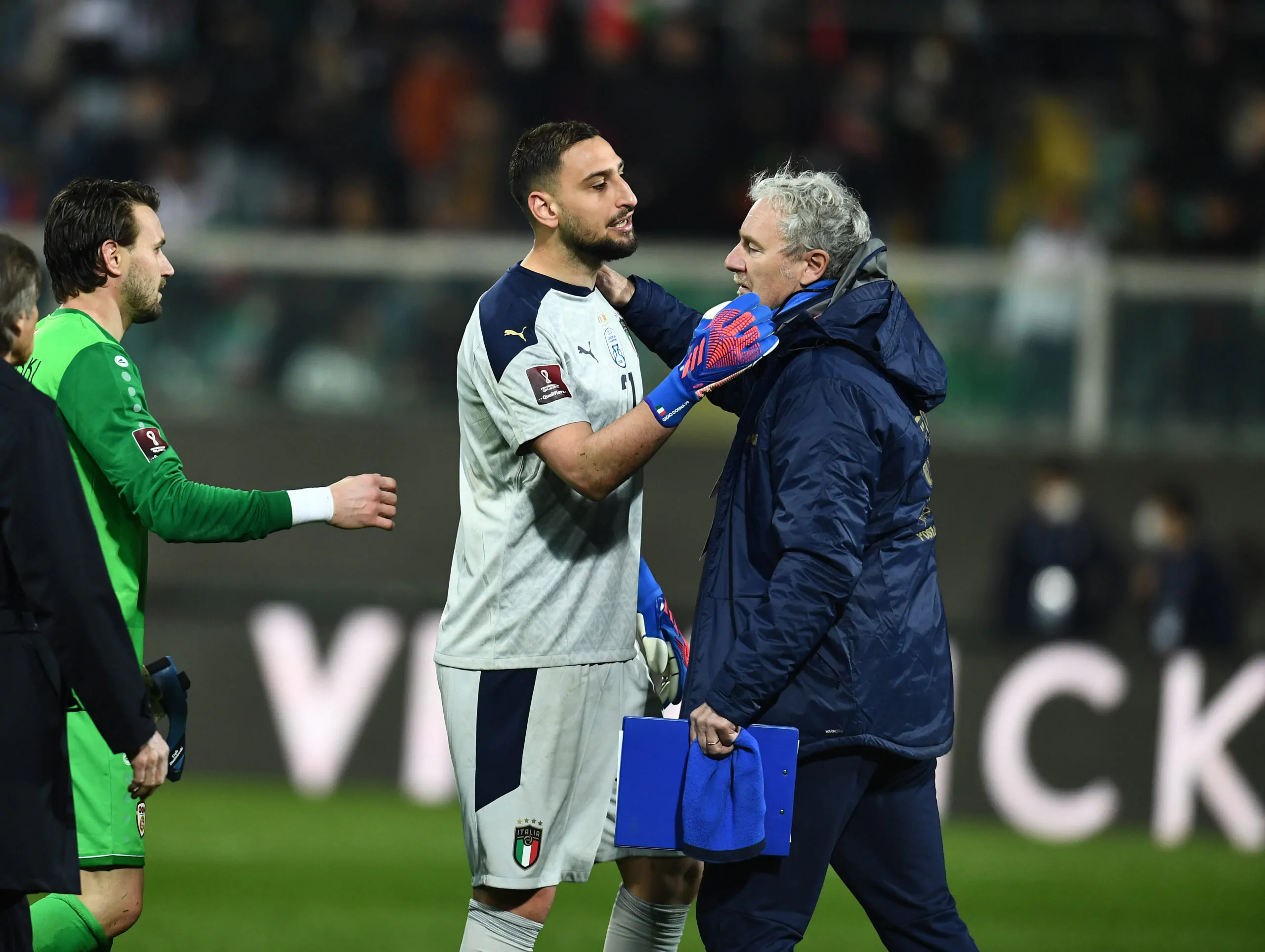 PALERMO, ITALY - MARCH 24: Gianluigi Donnarumma of Italy reacts at the end of the 2022 FIFA World Cup Qualifier knockout round play-off match between Italy and North Macedonia at Stadio Comunale Renzo Barbera on March 24, 2022 in Palermo, Italy . (Photo by Claudio Villa/Getty Images)