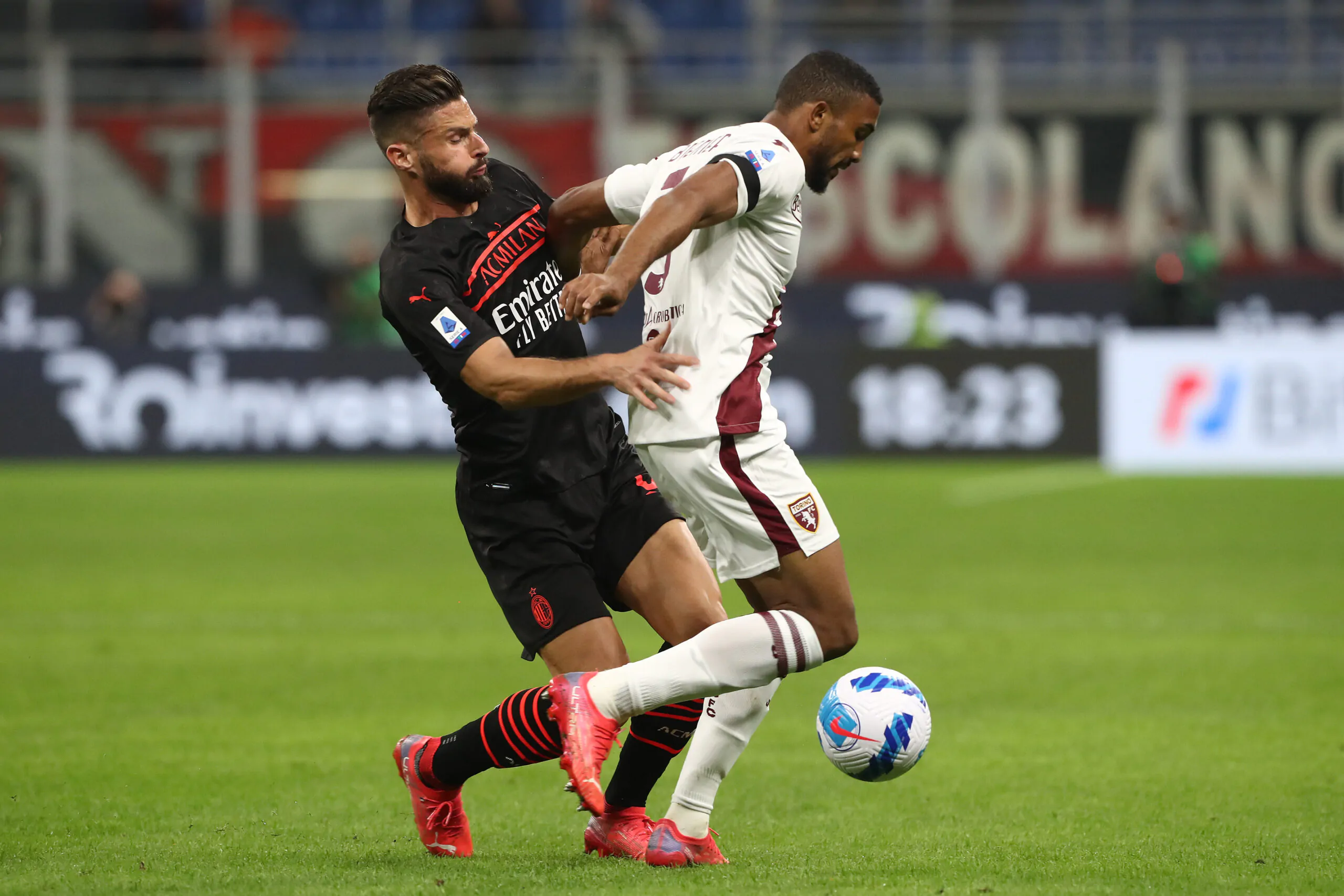 MILAN, ITALY - OCTOBER 26: Bremer of Torino FC is challenged by Olivier Giroud of AC Milan during the Serie A match between AC Milan and Torino FC at Stadio Giuseppe Meazza on October 26, 2021 in Milan, Italy. (Photo by Marco Luzzani/Getty Images)