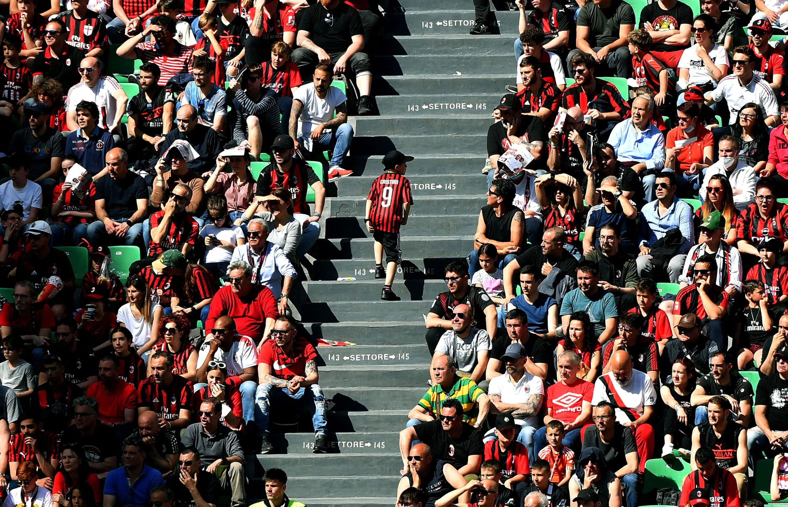 A young AC Milan supporter walks on a stairway during the Serie A football match between AC Milan and Fiorentina at Meazza Stadium in Milan on May 1, 2022. - (Photo by Tiziana FABI / AFP) (Photo by TIZIANA FABI/AFP via Getty Images)
