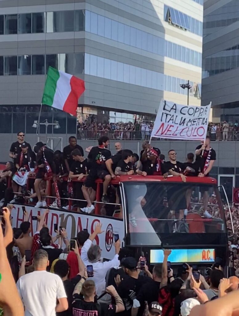 Non si placano le polemiche in merito allo striscione mostrato dai giocatori del Milan, sul pullman durante la festa Scudetto con i tifosi.