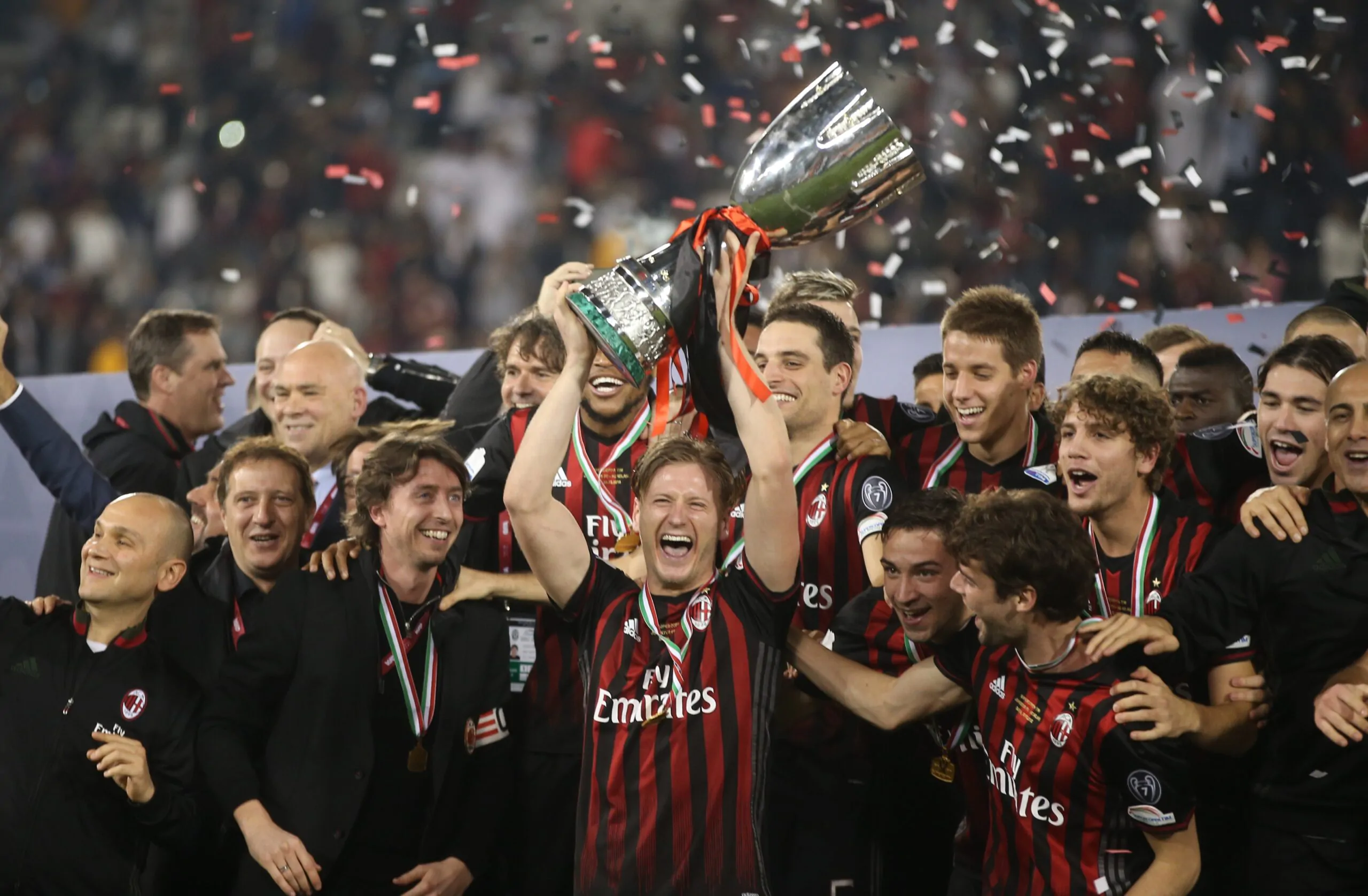 DOHA, QATAR - DECEMBER 23 : AC Milan team celebrating with Trophy after winning the Supercoppa TIM Doha 2016 match between Juventus FC and AC Milan at the Jassim Bin Hamad Stadium on December 23, 2016 in Doha, Qatar. (Photo by AK BijuRaj/Getty Images)