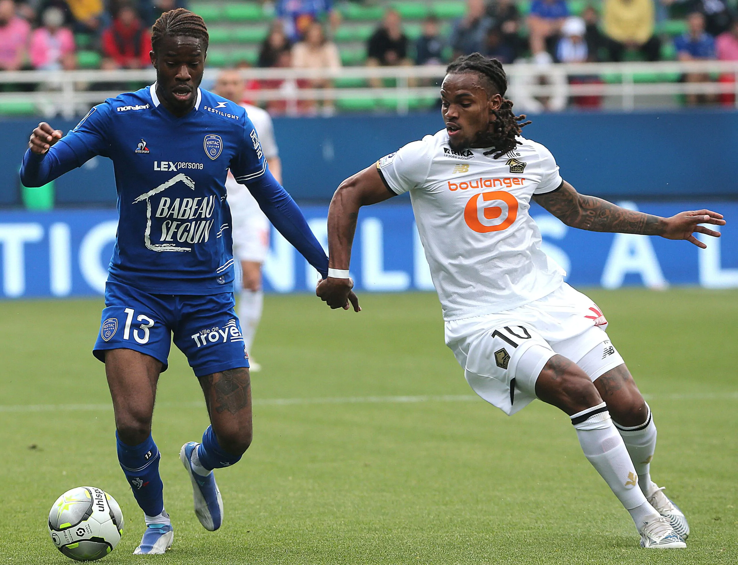 Troyes' Canada forward Ike Ugbo (L) fights for the ball with Lille's Portuguese midfielder Renato Júnior Luz Sanches (R) during the French L1 football match between ES Troyes AC and Lille OSC at Stade de l'Aube in Troyes, north-eastern France, on May 1, 2022. (Photo by FRANCOIS NASCIMBENI / AFP) (Photo by FRANCOIS NASCIMBENI/AFP via Getty Images)