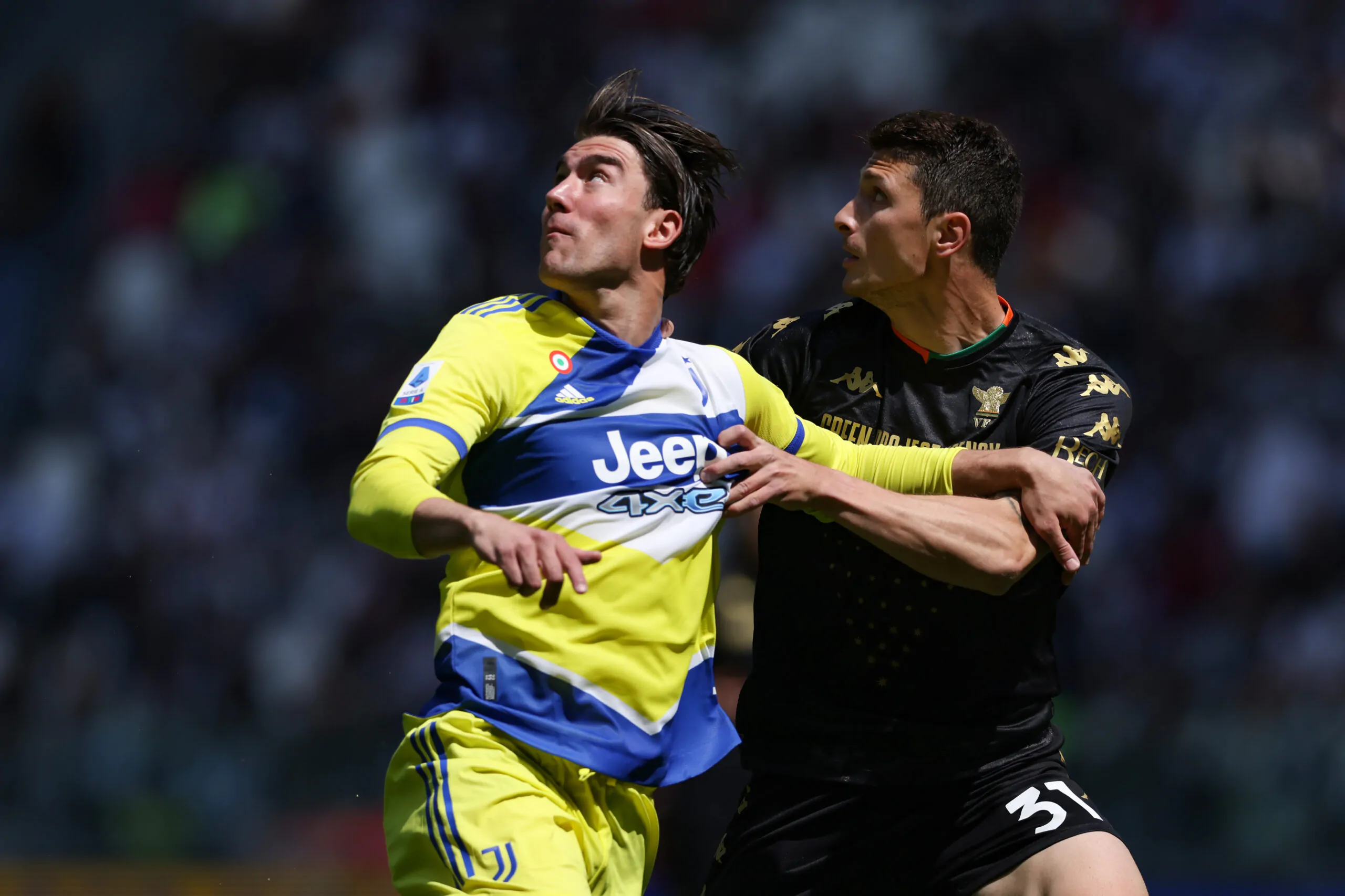 TURIN, ITALY - MAY 01: Mattia Caldara of Venezia FC tussles with Dusan Vlahovic of Juventus during the Serie A match between Juventus and Venezia FC at Allianz Stadium on May 01, 2022 in Turin, Italy. (Photo by Jonathan Moscrop/Getty Images)