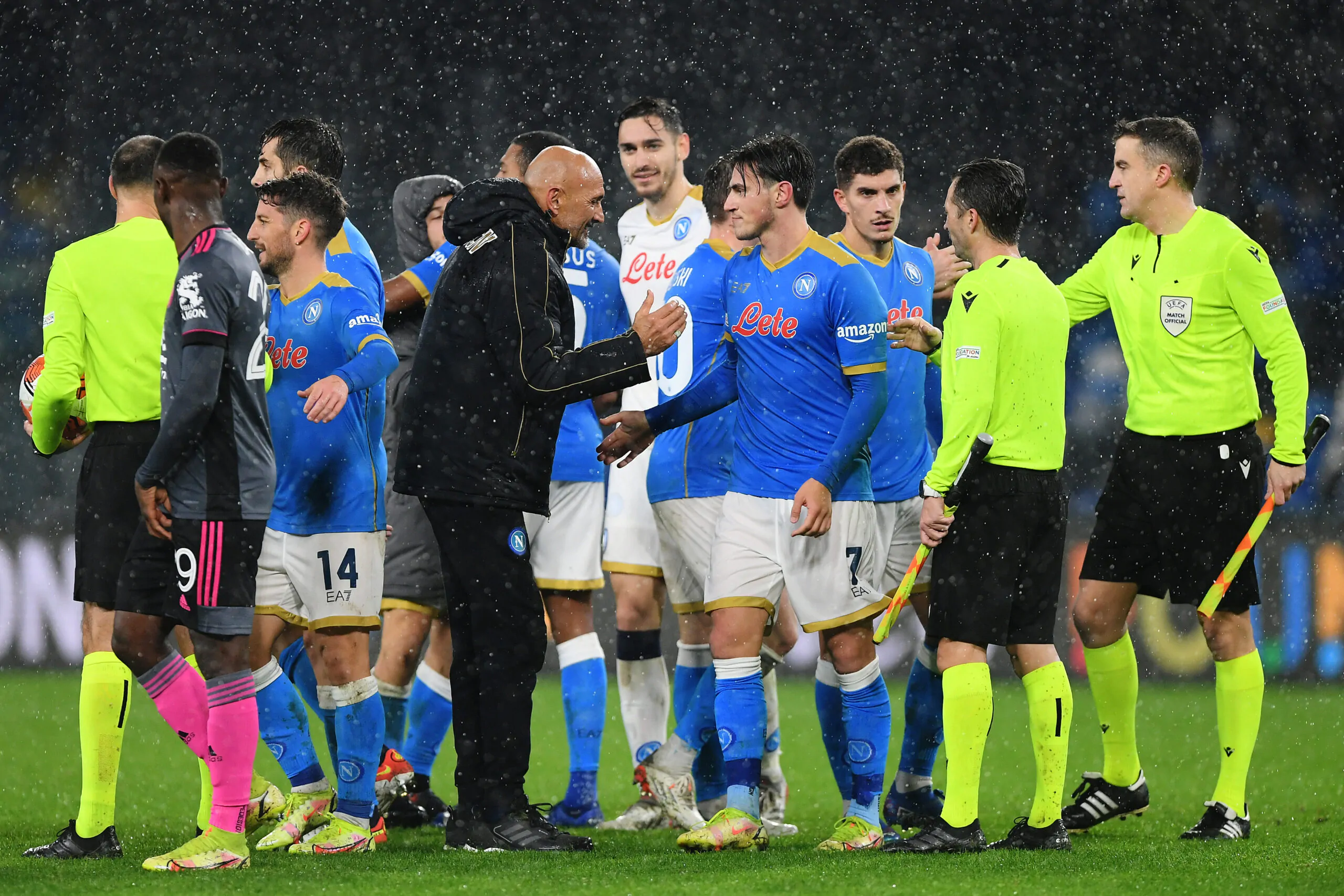 NAPLES, ITALY - DECEMBER 09: Luciano Spalletti embraces Eljif Elmas of SSC Napoli after their sides victory in the UEFA Europa League group C match between SSC Napoli and Leicester City at Stadio Diego Armando Maradona on December 09, 2021 in Naples, Italy. (Photo by Francesco Pecoraro/Getty Images)