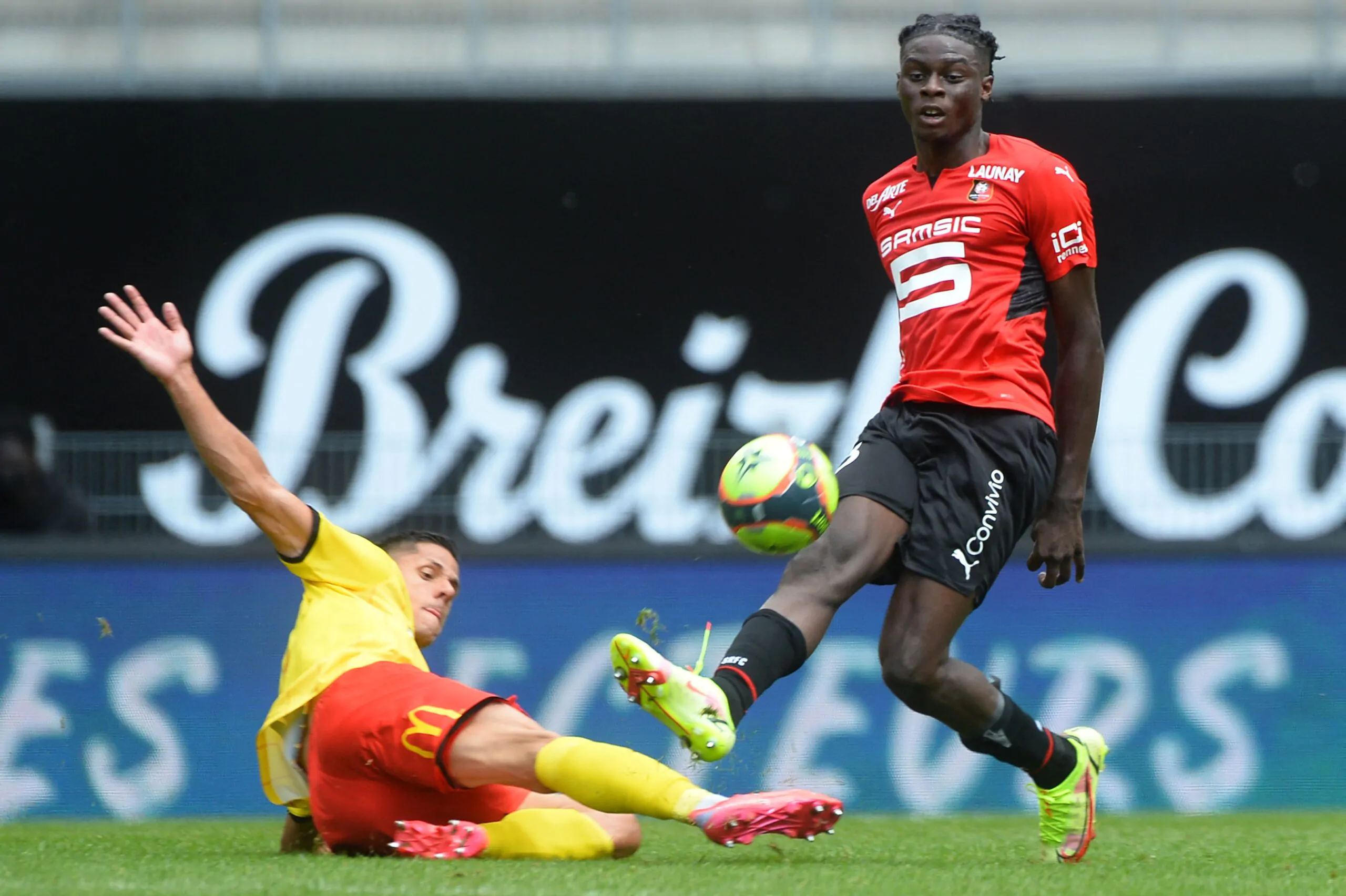 Rennes' French midfielder Lesley Ugochukwu (R) fights for the ball with Lens' French forward Florian Sotoca (L) during the French L1 football match between Stade Rennais (Rennes) and RC Lens at The Roazhon Park Stadium in Rennes, northern France on August 8, 2021. (Photo by JEAN-FRANCOIS MONIER / AFP) (Photo by JEAN-FRANCOIS MONIER/AFP via Getty Images)