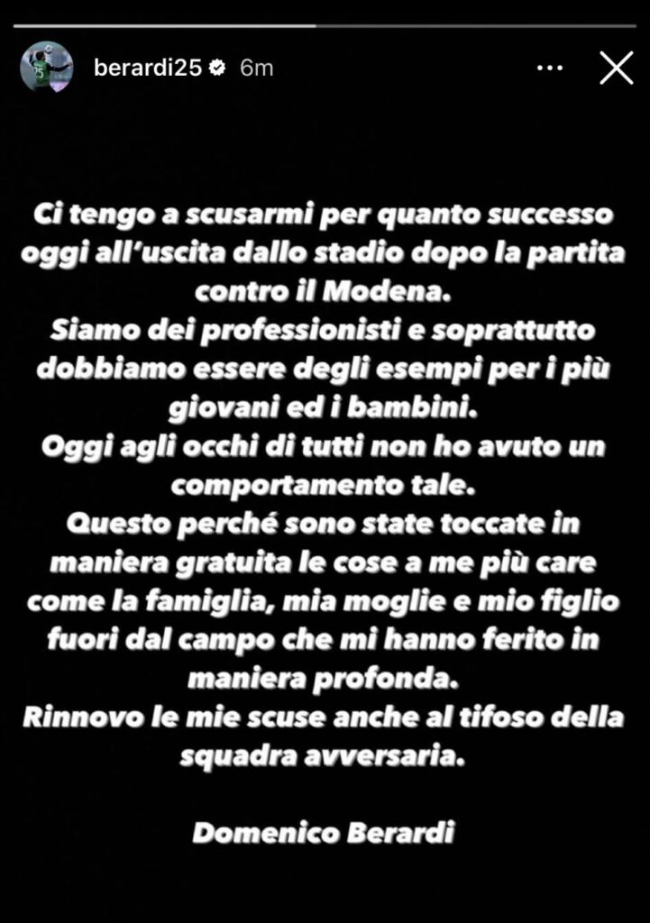 Nel frattempo sono arrivate anche le scuse da parte di Berardi attraverso una storia sul suo profilo Instagram: