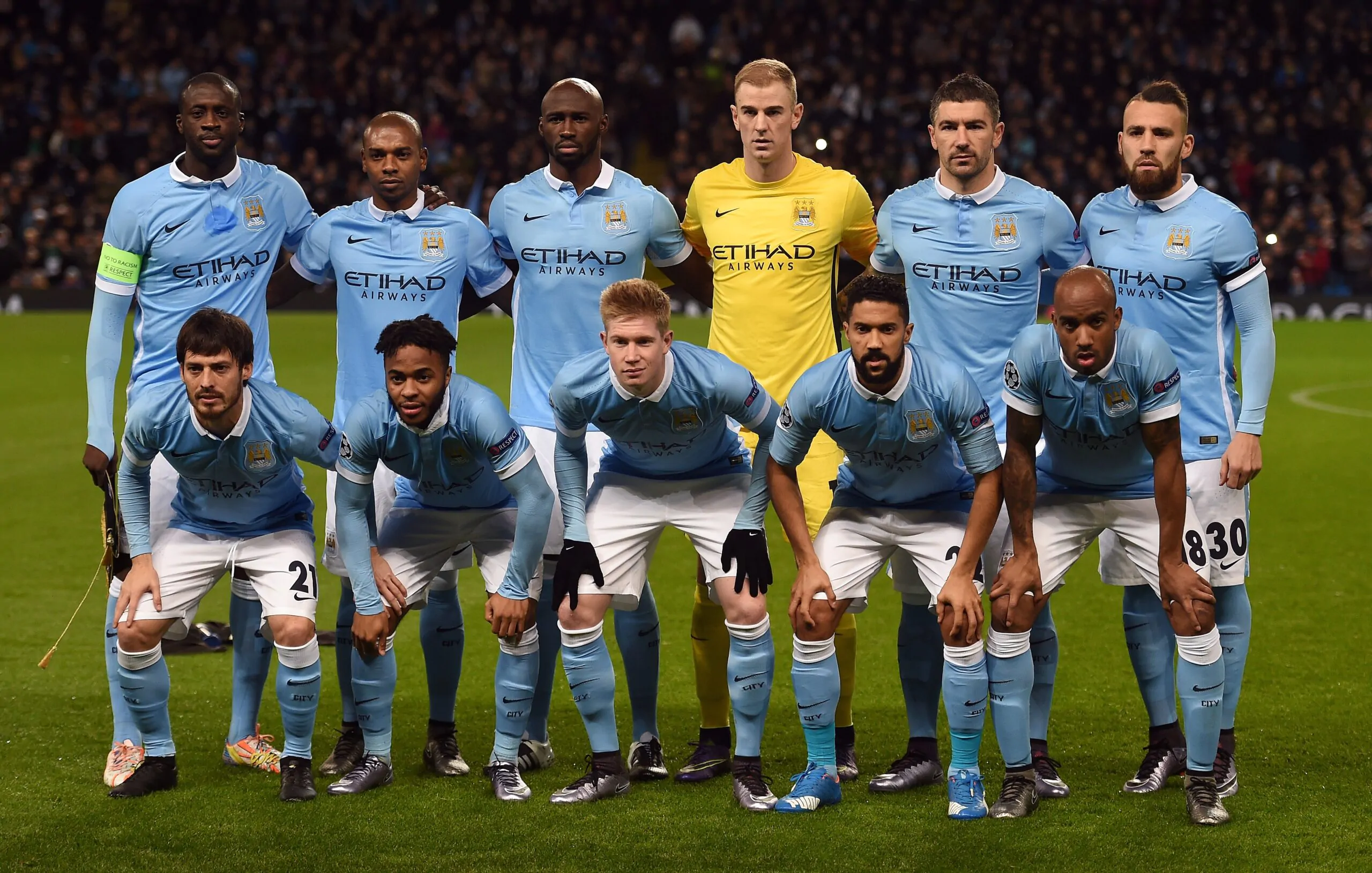 Manchester City's starting XI pose for the official photograph (top row L-R) Ivorian midfielder Yaya Toure, Brazilian midfielder Fernandinho, French defender Eliaquim Mangala, English goalkeeper Joe Hart, Serbian defender Aleksandar Kolarov and Argentinian defender Nicolas Otamendi and (bottom row L-R) Spanish midfielder David Silva, English forward Raheem Sterling, Belgian midfielder Kevin De Bruyne, French defender Gael Clichy and English midfielder Fabian Delph before the UEFA Champions League Group D football match between Manchester City and Borussia Moenchengladbach at the Etihad Stadium in Manchester, northwest England, on December 8, 2015. AFP PHOTO/PAUL ELLIS / AFP / PAUL ELLIS (Photo credit should read PAUL ELLIS/AFP via Getty Images)