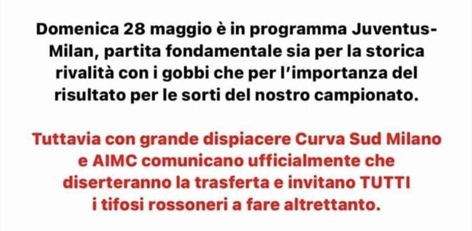 Domenica 28 maggio è in programma Juventus-Milan, partita fondamentale sia per la storica rivalità con i gobbi che per l’importanza del risultato per le sorti del nostro campionato. Tuttavia con grande dispiacere Curva Sud Milano e AIMC comunicano ufficialmente che diserteranno la trasferta e invitano TUTTI i tifosi rossoneri a fare altrettanto