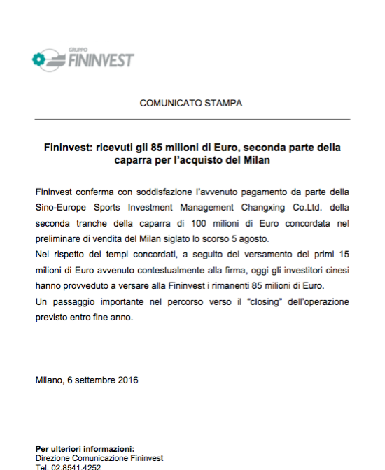 COMUNICATO UFFICIALE/ Fininvest: “Ricevuti gli 85 milioni di euro. Passaggio importante verso il closing”